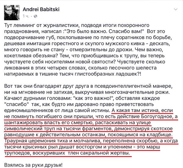 Лента у меня весь день алармирует на марш памяти Немцова. Фото и видео со счастливыми гражданами на траурном мероприятии, лозунги про Путина на нары, а Крым - Украине, фрики, скандирование "Слава Украине! Героям слава!", в общем - привычный набор.